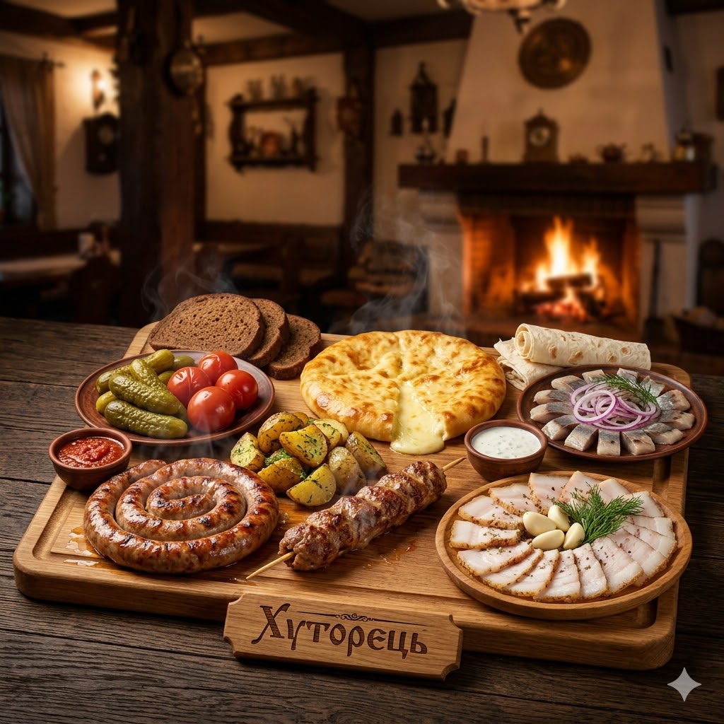 Ситне доповнення: гаряче хачапурі по-імеретинськи з сиром (300 г) та рум’яна картопля по-селянськи (200 г).