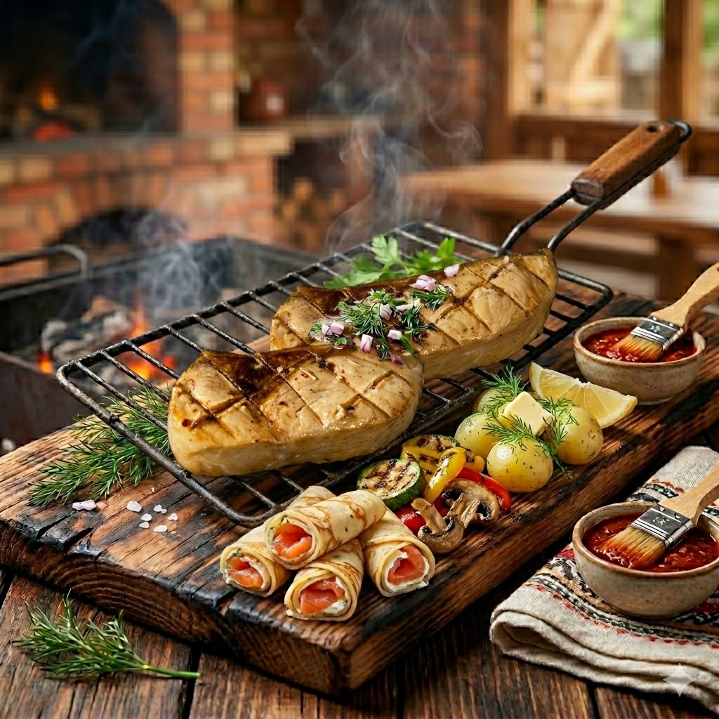 Цей набір створений для тих, хто цінує легкість, користь та насичений смак справжнього гриль-меню. Головна зірка сету — ніжний білий амур, запечений на мангалі до золотої скоринки, який ідеально доповнюється традиційними українськими закусками.